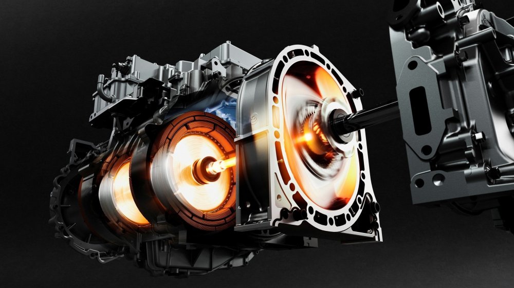 Характеристики генератора и РПД в гибриде последовательно типа потребителя вообще не должны волновать — на максимальную скорость они, как говорится, не влияют, но Mazda всё же раскрыла базовые параметры двигателя 8C: радиус ротора — 120 мм, ширина — 76 мм, впрыск топлива — непосредственный, степень сжатия — 11,9:1, есть система рециркуляции отработавших газов, сажевый фильтры и каталитический нейтрализатор, чтобы РПД соответствовал актуальным экологическим нормам. Максимальная отдача — 55 кВт (75 л.с.) при 4700 об/мин и 116 Нм при 4000 об/мин, то есть агрегат по меркам РПД довольно «тихоходный».