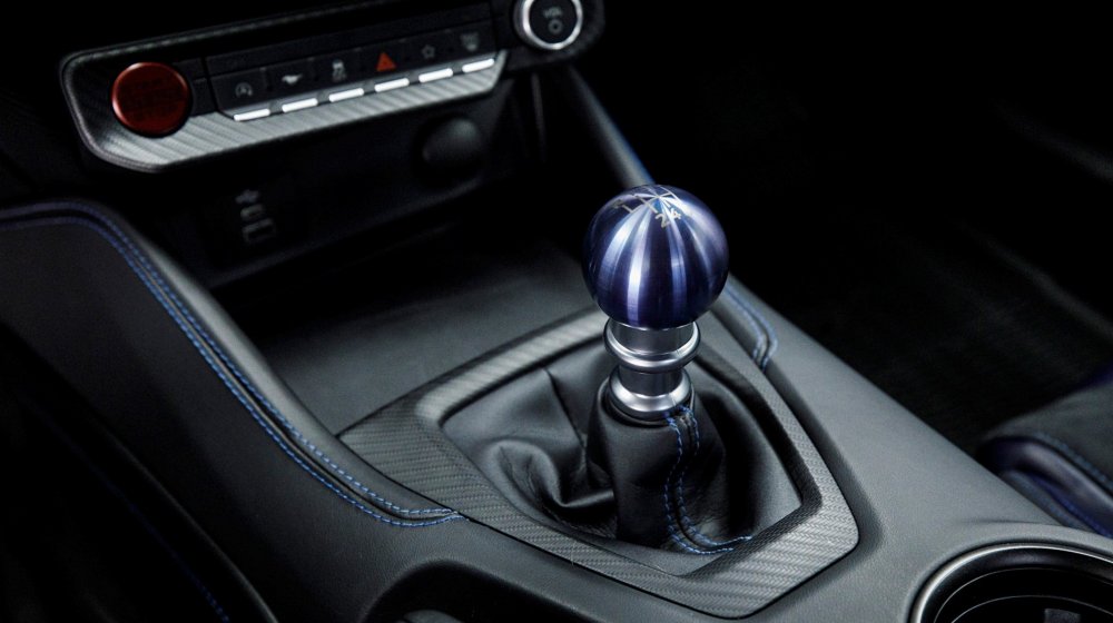 В паре с мотором V8 на версии Dark Horse работает усиленная 6-ступенчатая МКП Tremec TR-3160 либо 8-ступенчатый гидромеханический «автомат», вся мощность передаётся на задние колёса через самоблокирующийся дифференциал. Рычаг переключения МКП на «тёмной лошадке» увенчан синим анодированным шарообразным набалдашником из титана — он меньше нагревается на жаре, чем стандартный алюминиевый. Версии с «автоматом» положен стандартный пластмассовый селектор, зато у неё есть уникальные подрулевые лепестки ручного переключения передач из анодированного серебра.
