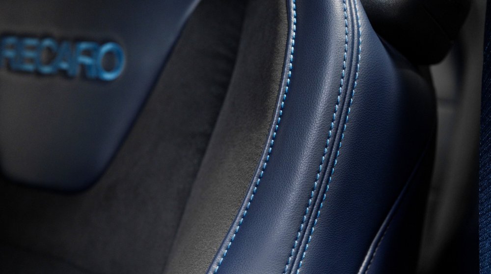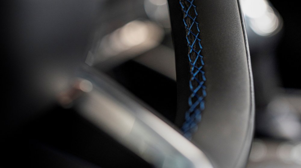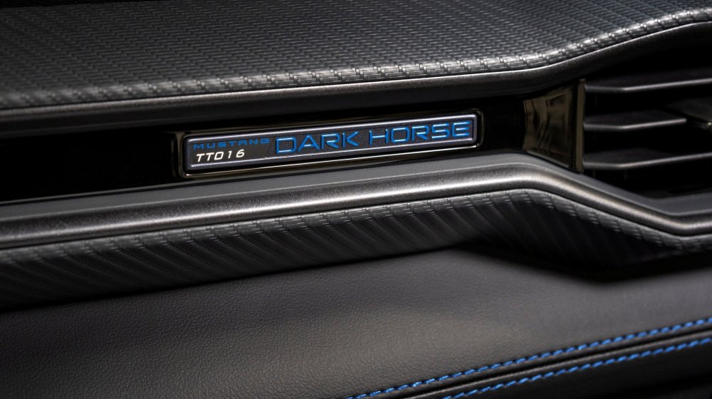 Двухэкранное табло — стандартное (приборный экран — 12,4 дюймовый, мультимедийный — 13,2-дюймовый), с нарядной графикой на игровом движке 3D Unreal Engine, а вот передняя панель у «тёмной лошадки» имеет особую текстуру, имитирующую переплетённое углеродное волокно, и норную табличку модели. Элементы кожаной обивки прошиты контрастной нитью синего цвета, рулевое колесо снабжено замшевыми вставками для лучшей фиксации рук. За доплату доступен Dark Horse Appearance Package с особыми креслами Recaro с развитой боковой поддержкой, замшевыми вставками и синими ремнями безопасности.