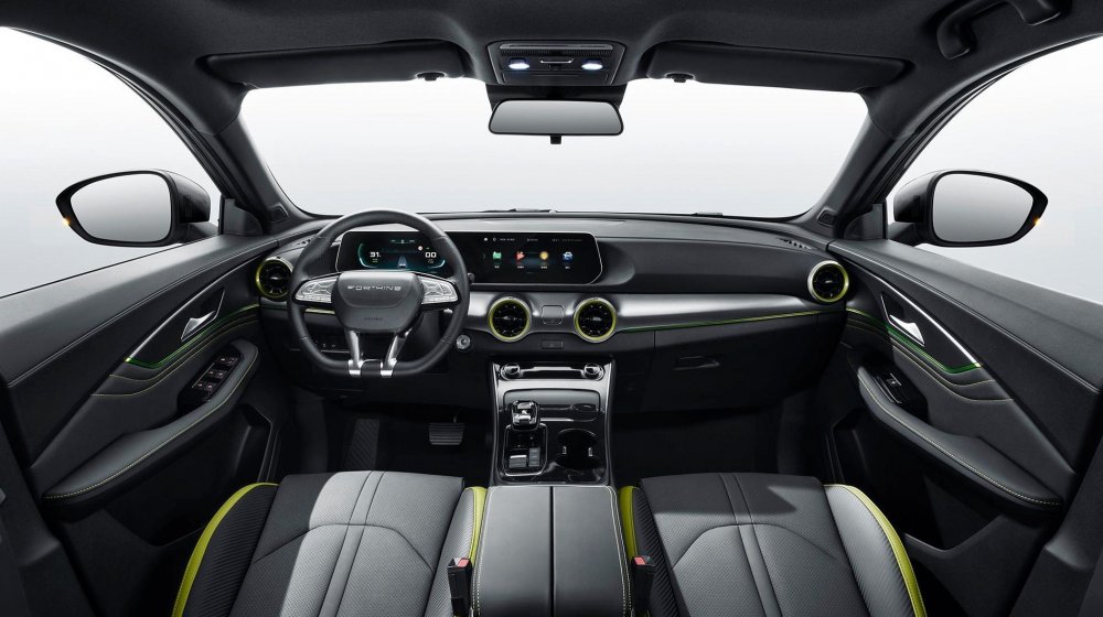 Интерьер Forthing Thunder оформлен в духе спортивных машин — круглые воздуховоды, контрастные цветные вставки, пластик «под карбон». Приборный и мультимедийный экраны (оба 10,25-дюймовые) объединены в общее табло, на центральной консоли есть отдельный блок микроклимата, но с сенсорными клавишами. Возможно, у кроссовера российской сборки будут свои интерьерные особенности. Объём багажника не указан, но, судя по фотографиям китайских коллег, он не очень вместительный. В богатых комплектациях Forthing Thunder имеет более десятка электронных ассистентов водителя, в том числе адаптивный круиз-контроль.