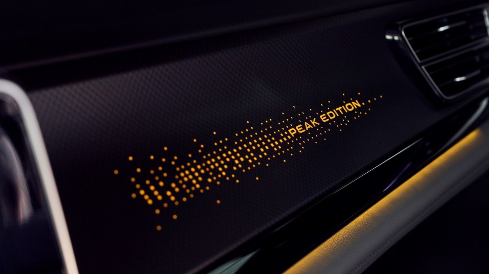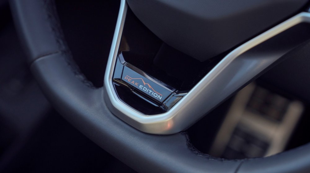 Отличительные черты версии Peak Edition в салоне — это двухцветная обивка кожзамом с контрастной оранжевой прострочкой, клетчатая текстура на передней панели с надписью Peak Edition, перемычка с надписью Peak Edition на руле и новые цвета контурной светодиодной подсветки.