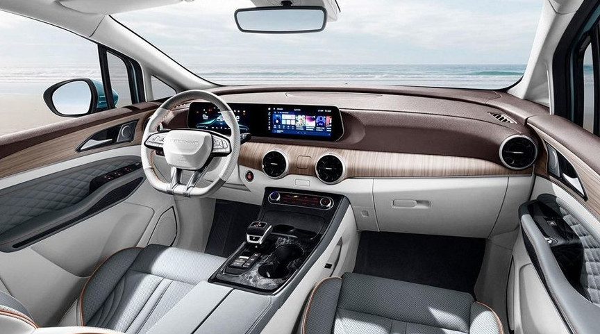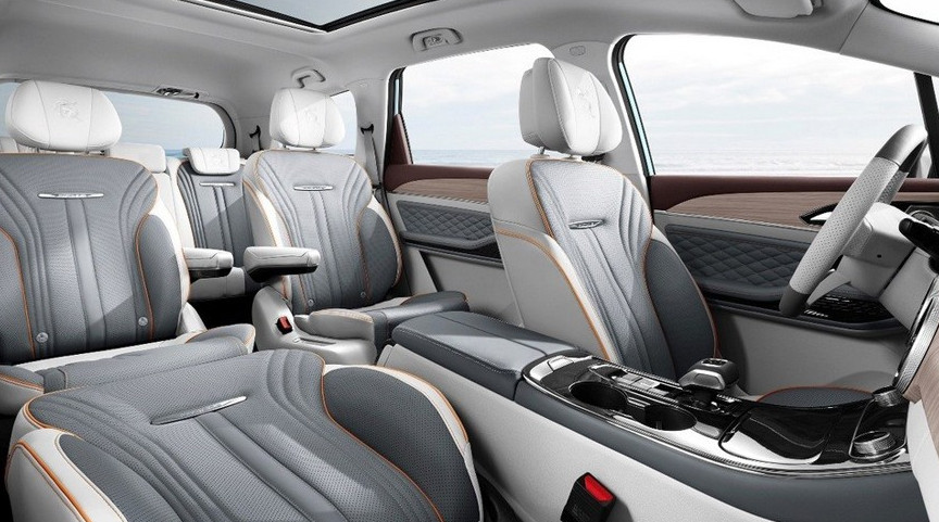 У «Яхты» три ряда сидений, посадочная формула – 2+2+3. При этом средний ряд представляет собой отдельные кресла, оснащённые обогревом и вентиляцией. Большую часть передней панели занимает единый дисплей, объединяющий в себе виртуальную «приборку» и тачскрин мультимедийной системы (диагональ каждого – 10,25 дюйма).