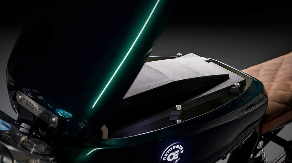 Главный узел Metorbike — это пристыкованная к электромотору хитроумная акустическая система в корпусе с оребрением (имитация ДВС воздушного охлаждения), которая при езде генерирует насыщенный рокот поршневого двигателя довольно мощного кафе-рейсера, причём звук выходит через углепластиковый резонатор, стилизованный под выхлопную трубу — выглядит всё это очень эффектно. Между «баком» и моторно-звуковым модулем есть свободное пространство, куда за крючки можно подвесить, например, продуктовую авоську.