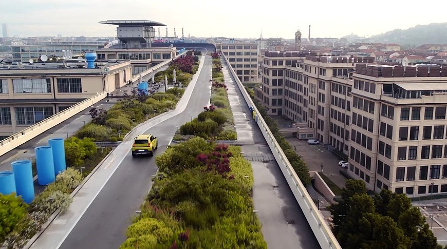 Fiat Grande Panda на крыше завода в Линготто. К началу 80-х этот завод устарел, в 1982-м его закрыли и постепенно превратили в своеобразный дом культуры Fiat: сегодня в гигантском комплексе расположены концертные залы, рестораны, картинная галерея, отель, торговый центр и другие общественные пространства. Последний апгрейд комплекса завершился в прошлом году: крышу основного корпуса с треком превратили в крупнейший в Европе висячий сад.
