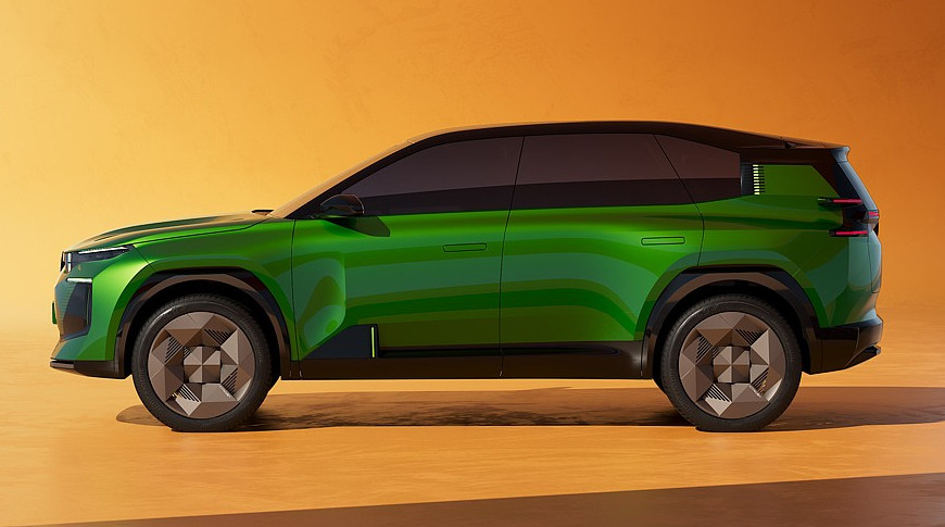У автомобиля на изображении фары соединены между собой узкой решёткой радиатора (у полностью электрических вариантов на этом месте будет похожая заглушка), по центру этого элемента находится нынешний овальный логотип. В нижнюю часть переднего бампера интегрированы противотуманки, необычно оформленные боковые и шестиугольный центральный воздухозаборник с рисунком в виде наклонённых под углом тонких и частых полосок.