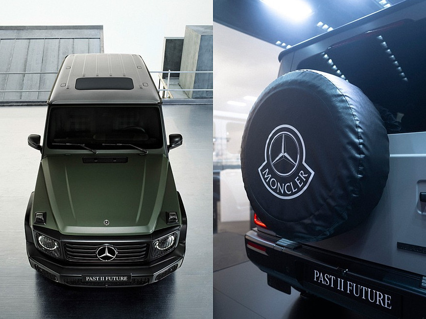 В интерьере исполнения внедорожника, получившего название Past II Future, тоже есть свои особенности. Обивка сидений имеет рисунок в крупную клетку (отсылка к ранее выпускавшимся G-Class), а на кожаных подголовниках есть вышивка с трёхлучевой звездой и название бренда одежды Moncler (участвовал в разработке проекта наряду с японским дизайнером NIGO). Такой же рисунок можно увидеть на чехле запаски.