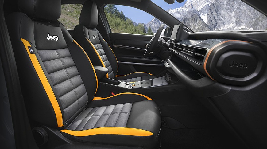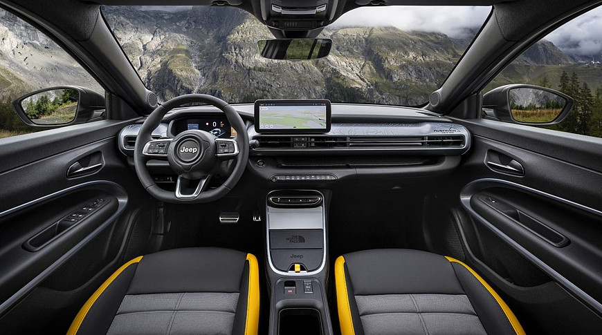 Сиденья в салоне обтянуты моющейся тканью, потолок получил чёрную обивку, на серебристой передней панели пара дисплеев диагональю 10,25 дюйма – виртуальная приборки и тачскрин информационно-развлекательной системы. В списке оборудования Jeep Avenger 4xe числятся: адаптивный круиз-контроль, система помощи при спуске, камера заднего вида с обзором на 180 градусов, автоматическое переключение с дальнего света фар на ближний, а также функция запуска мотора без ключа.