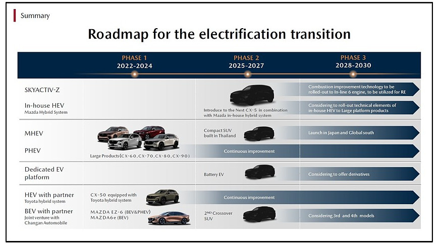 Собственный электрический кроссовер Mazda появится до конца 2027 года, он дополнит «электрички», разработанные на платформах китайской компании Changan, точнее, её дочернего бренда Deepal — это лифтбек Mazda EZ-6 (в Европе Mazda 6e) и будущий кроссовер Mazda CX-6e. Также Mazda рассматривает возможность разработки ещё двух электрических моделей на платформах Changan.