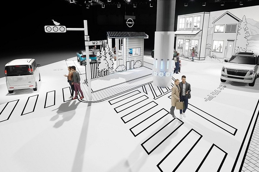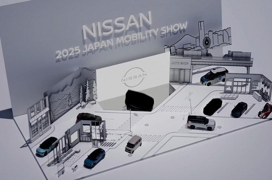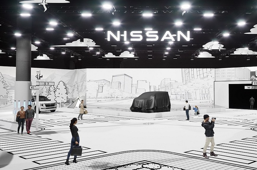 Стенд Nissan на домашнем автосалоне. Главной премьерой станет вовсе не рестайлинговая Ariya, а минивэн Elgrand следующего поколения. Именно он спрятан под пологом в центре экспозиции. Но свежих тизеров MPV пока нет