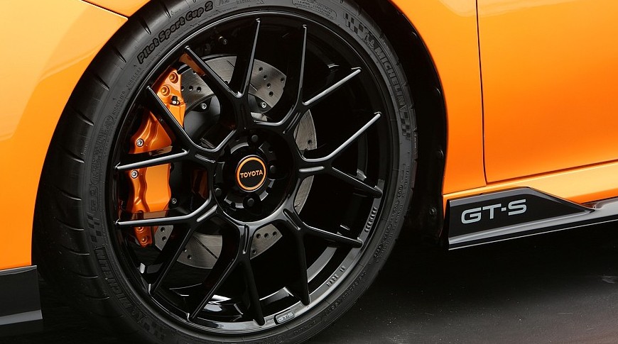 Благодаря регулируемым амортизационным стойкам подвеска Toyota Camry GT-S занижена на 38 мм, а внутри ажурных 20-дюймовый колёс, обутых в шины Michelin Pilot Sport Cup 2, хорошо видны мощные дисковые тормоза: диаметр передних тормозных дисков — 365 мм (8-поршневые суппорты), задних — 356 мм (6-поршневые суппорты). Предполагается, что такая Camry рулится точнее и увереннее, чем стоковые версии, но не предлагает дополнительной мощности, в распоряжении водителя прежние 235 гибридных лошадиных сил, приходящихся на 1670 кг снаряженной массы, то есть можно рассчитывать лишь на степенную разгонную динамику.