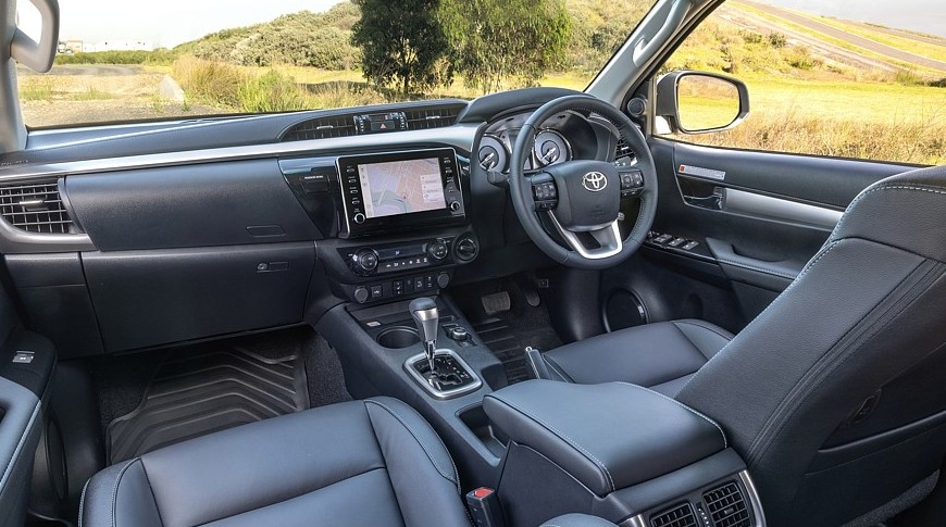 Салон нового Hilux пока никак не засвечен, но ранее те же австралийские СМИ публиковали патентные изображения передней панели: она очень похожа на переднюю панель актуального Toyota Land Cruiser Prado, только изменена форма воздуховодов, а приборный и мультимедийный экран разъединены (у Prado они вписаны в общую рамку).