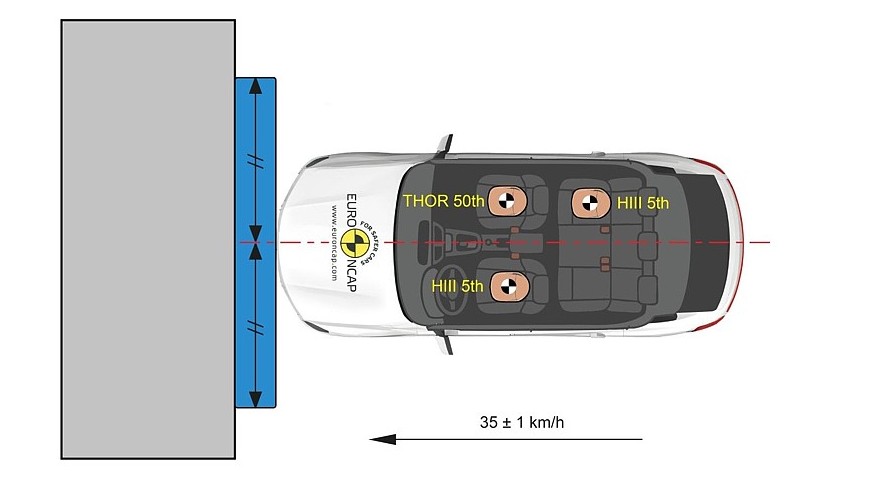 Фронтальный удар о стену на скорости 50 км/ч заменён фронтальным ударом о деформируемый барьер на скорости 35 км/ч — эксперты Euro NCAP считают, что этот тест точнее отражает реальность, то есть наиболее часто случающиеся аварии. В этом тесте за рулём будет сидеть женщина пятого перцентиля, на месте переднего пассажира — мужчина пятидесятого перцентиля, за ним во втором ряду — ещё одна женщина пятого перцентиля. Этот же фронтальный удар о деформируемый барьер будет воспроизведён виртуально на скоростях 50 и 56 км/ч, причём с разными манекенами (пятого, пятидесятого и девяносто пятого перцентилей). Таким образом Euro NCAP хочет учесть влияние размеров и массы тела на результаты теста.