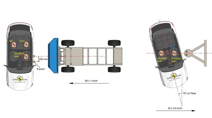 Два прежних боковых краш-теста сохранены, а именно удар о деформируемый барьер на скорости 60 км/ч и удар о столб на скорости 32 км/ч, но они будут дополнены виртуальными краш-тестами. При ударе о деформируемый барьер за рулём сидит мужчина пятидесятого перцентиля, на заднем сиденье — дети 6- и 10-летнего возраста. При ударе о столб за рулём сидит мужчина пятидесятого перцентиля, на месте переднего пассажира — он же, то есть идентичный манекен, но откинувший спинку кресла немного назад для более удобной посадки. Разница в посадке может снизить эффективность центральной подушки безопасности, защищающей водителя и переднего пассажиров от ударов друг о друга. Нагрузки при отскоке и опасные изгибы тела по-прежнему измеряются в полном объёме.