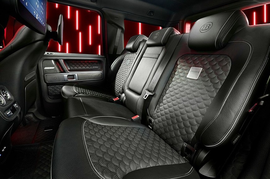 Салон, как принято у топовых моделей Brabus, полностью перешит собственной стёганой перфорированной кожей, при этом углепластиковых вставок стало больше — их теперь можно обнаружить в том числе на руле, поручнях и даже педалях. Руль вдобавок получил углепластиковые подрулевые лепестки ручного переключения передач 9-ступенчатого «автомата», каждый лепесток снабжён цветными светодиодными рисками, подсказывающим, что пора сменить ступень. Для пассажиров заднего дивана предусмотрены дублирующие приборы. В багажнике каждый покупатель Brabus 900 Rocket Edition обнаружит дорожную сумку Weekender, изготовленную из той же кожи, что и обивка сидений.