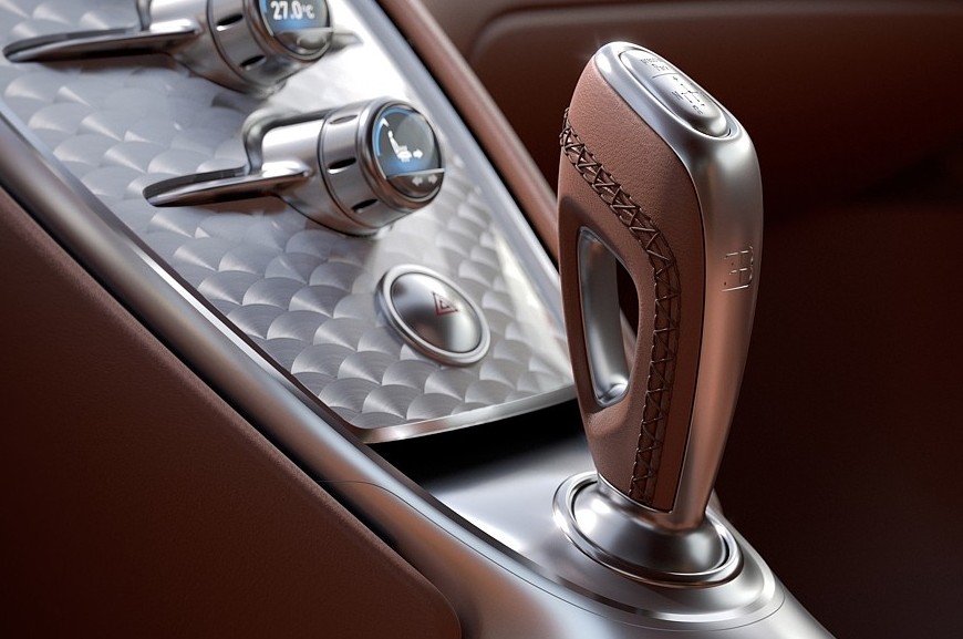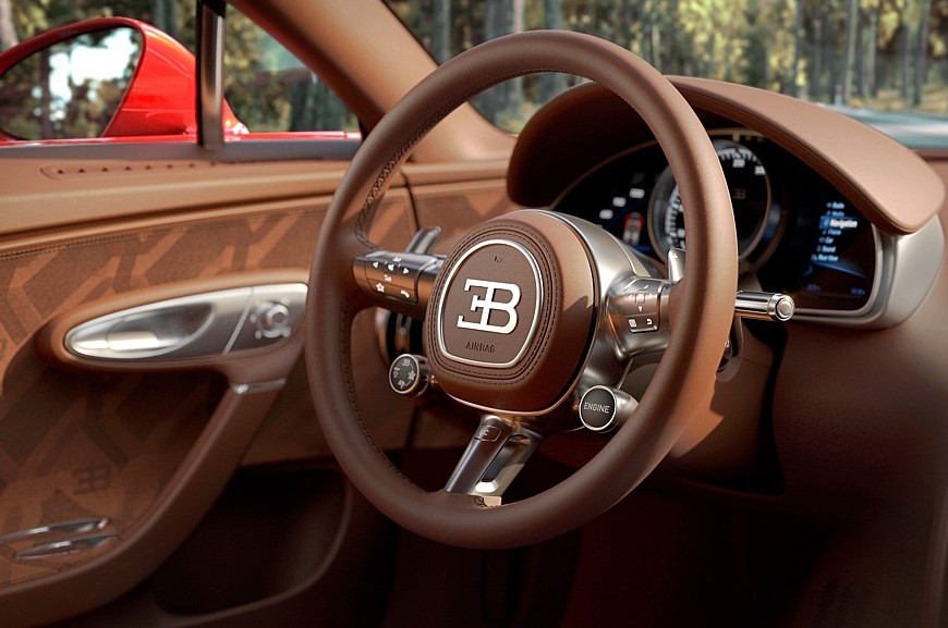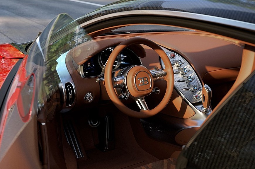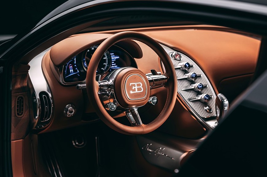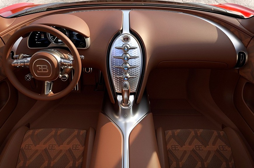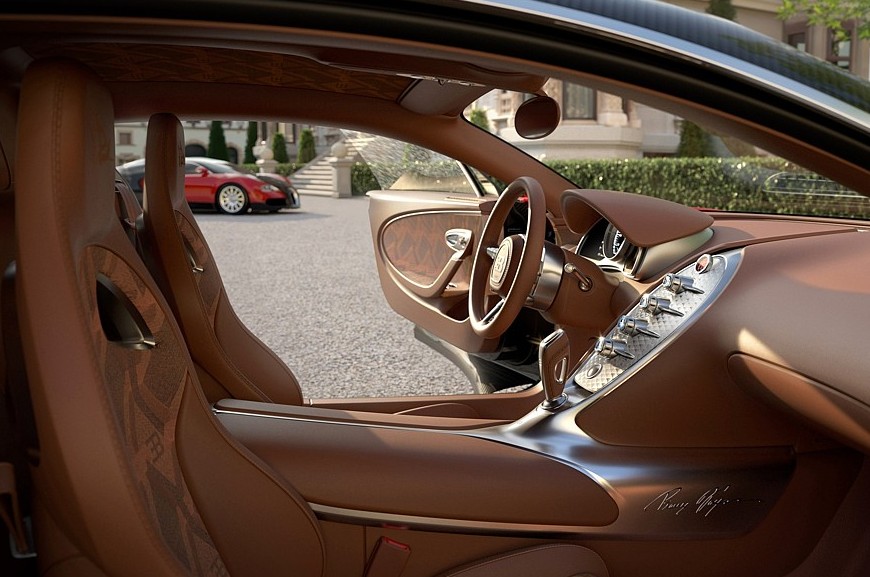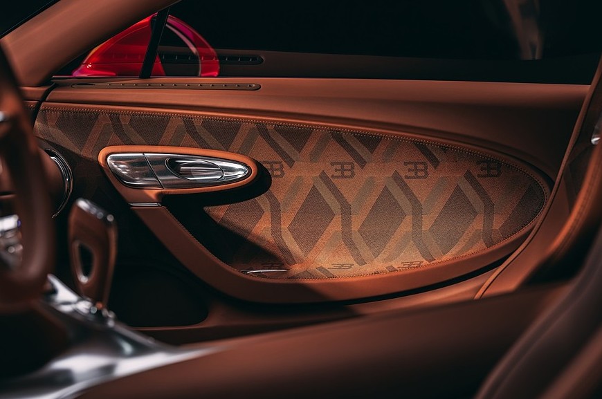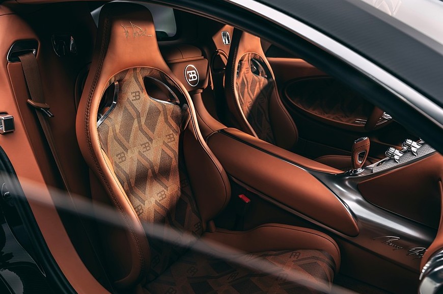 Салон тоже полностью переделан, хотя в нём сохранены основные компоновочные решения Вейрона, некоторые детали позаимствованы у моделей Chiron и Mistral. Центральная консоль стала у́же и изящнее, на её металлической поверхности разместился вертикальный ряд круглых регуляторов, а на самой вершине находятся уникальные часы с автоподзаводом, упакованные в металлический вьсьмигранный корпус. В щиток приборов добавлены настраиваемые многофункциональные экраны, но центральное место по-прежнему занимает большой стрелочный спидометр. Трёхспицевый руль новый, с металлическими сервисными клавишами и более крупными лепестками ручного переключения передач. Дверные карты тоже полностью переделаны — они, как и новые ковшеобразные сиденья, имеют комбинированную обивку из кожи и ткани ручной работы.