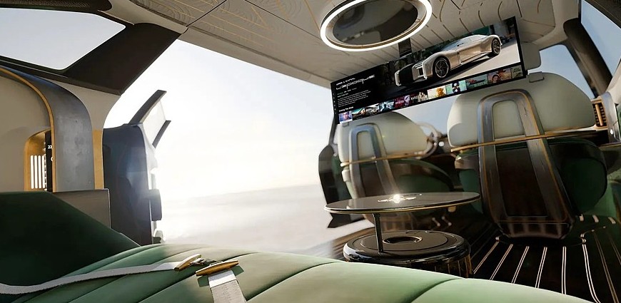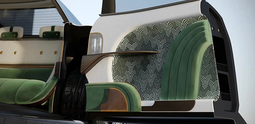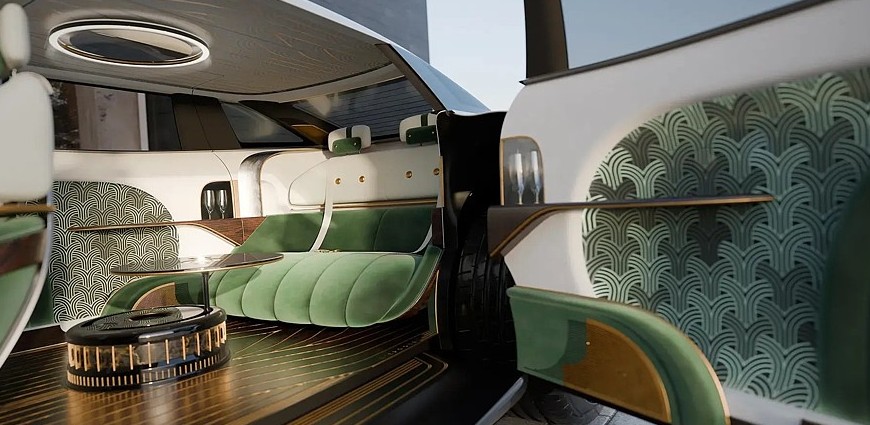 Салон напоминает гостиную роскошной виллы: кресла и задний диван здесь мебельного типа, с деревянным декором и пышной велюровой обивкой. Посадочная формула заявлена как 2+2+2, то есть где-то в салоне предусмотрены два раскладных стульчика. Перед задним диваном имеется столик на ножке, который может перемещаться по салону по круглой орбите. В дверных картах имеются ниши с бокалами для шампанского на четыре персоны. Под потолком подвешен широкий развлекательный экран. Управление светом, микроклиматом и прочими удобствами завязано на искусственный интеллект, понимающий голосовые команды.