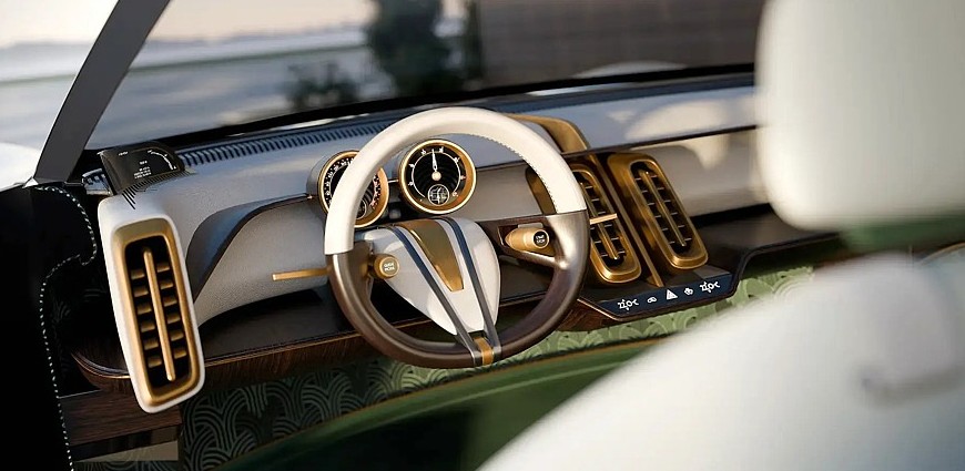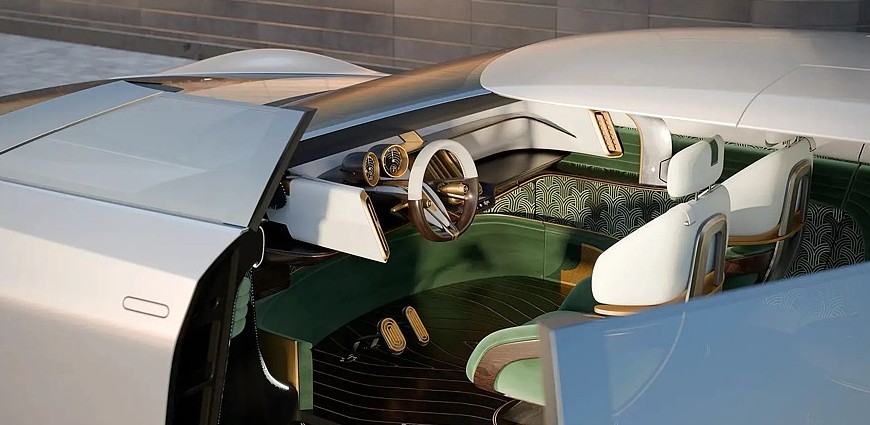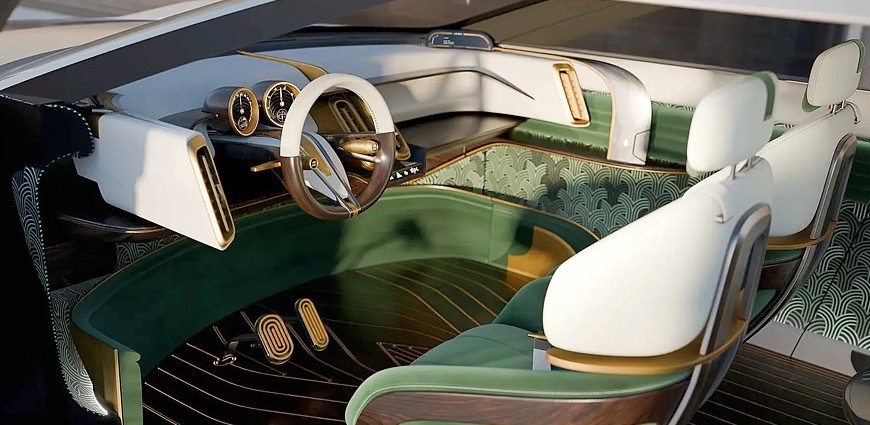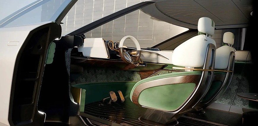 Место водителя выполнено в неоклассическом стиле с минимальным количеством элементов управления. В отделке широко используются натуральное дерево, кожа и дорогой текстиль. Щиток приборов — это два больших цифро-аналоговых циферблата. Мультимедийного экрана нет, его заменяет ИИ, через который можно задать любые настройки.