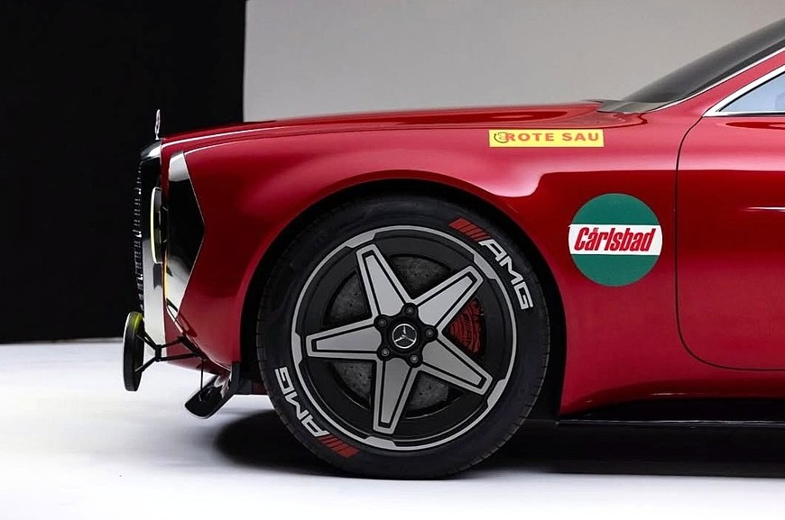 Шоукар сохранил все главные узнаваемые черты «Алой свиньи», в том числе большую, почти квадратную хромированную радиаторную решётку, вертикальные фары и четыре дополнительных прожектора, пухлые колёсные арки и трёхобъёмный кузов красного цвета с очень аппетитной кормой. Даже новые колёсные диски напоминают гоночные из начала 1970-х, но за их спицами скрываются современные и очень эффективные карбон-керамические тормоза (у оригинальной «Алой свиньи» тормоза были откровенно слабыми). Авторский штрих от Вагенера — это светодиодные звёзды в основных фарах, которыми он одарил несколько последних серийных новинок Mercedes-Benz, в том числе рестайлинговый S-класс.