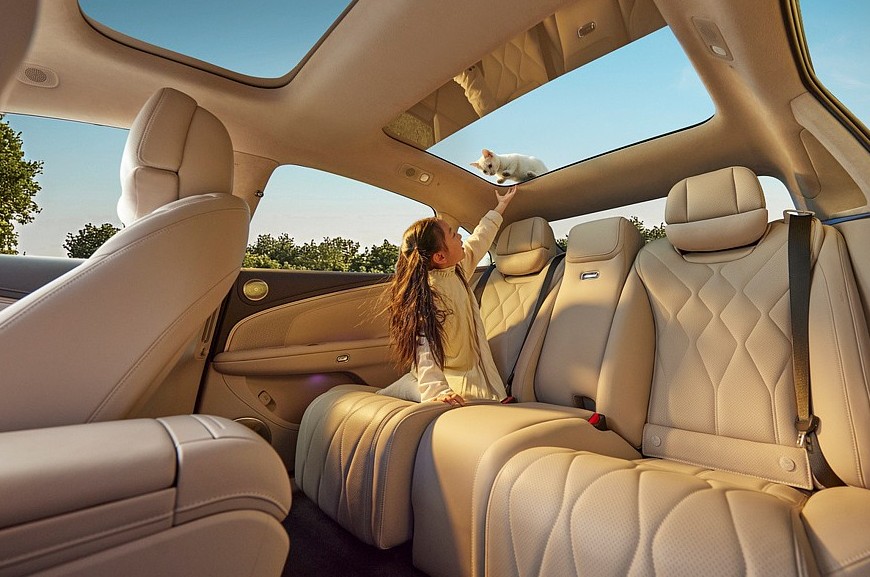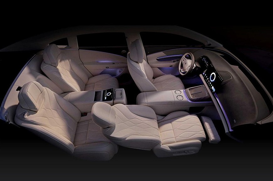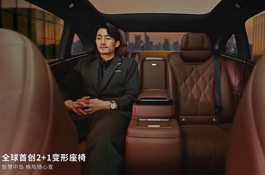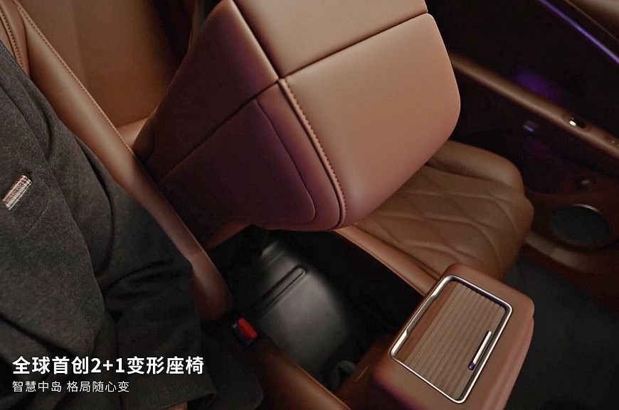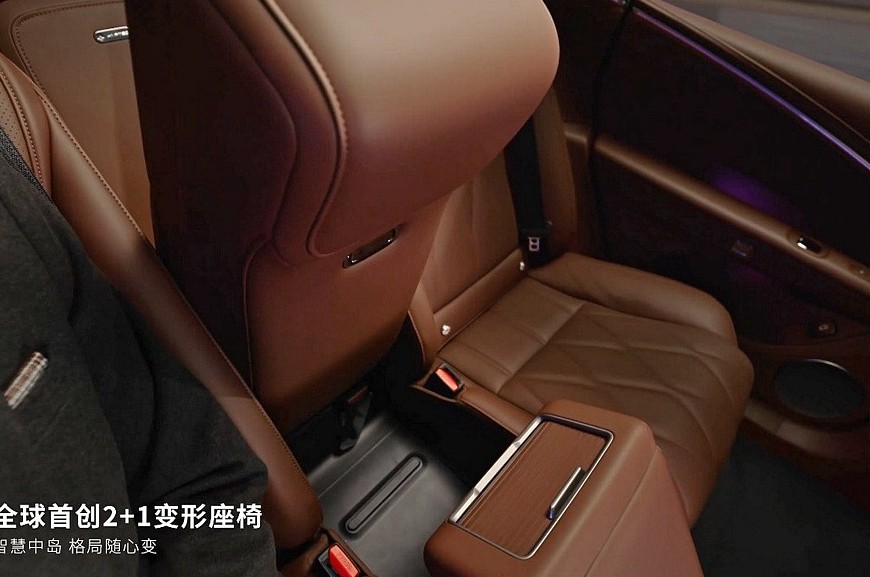 Предтоповое и самое богатое исполнения – это также пневмоподвеска, встроенный в фары проектор, натуральная кожа, дополнительная беспроводная зарядка спереди, отсек с функциями подогрева и охлаждения, система активного шумоподавления, динамики в подголовнике водительского кресла, массажер и подогрев всех сидений. А еще в этих комплектациях седан Hyptec A800 может стать четырехместным. Нужно будет лишь нажать кнопку, после чего центральная часть спинки заднего дивана опустится, а центральная же часть непосредственно сиденья – поднимется. В итоге, получится массивная «тумба» с отдельным тачскрином (7,9 дюйма), площадками для зарядки телефонов и ящичком, прикрытым шторкой. Такое решение в Hyptec назвали «2+1», для начальных версий это опция.