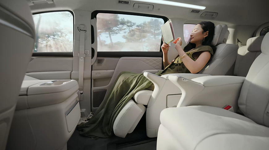 Внутреннее убранство флагманского минивэна может насчитывать до семи экранов. В список входят: виртуальный щиток приборов диагональю 10,25 дюйма, центральный тачскрин информационно-развлекательной системы и дисплей для переднего пассажира (диагональ каждого – 16,3 дюйма), 50-дюймовый проекционный дисплей AR-HUD, 21-дюймовый 4K-экран, установленный на потолке, а также пара мультимедийных экранчиков на 5,5 дюйма, предназначенных для пассажиров, расположившихся сзади.