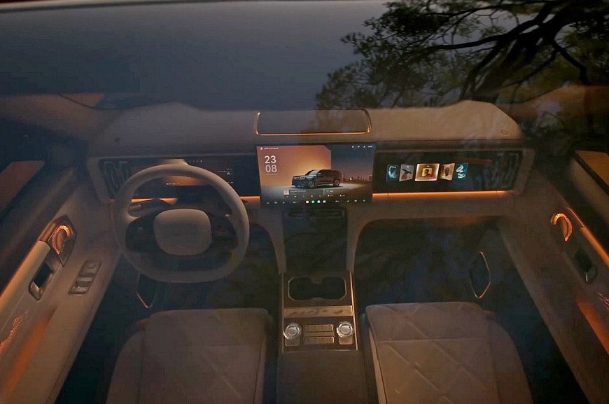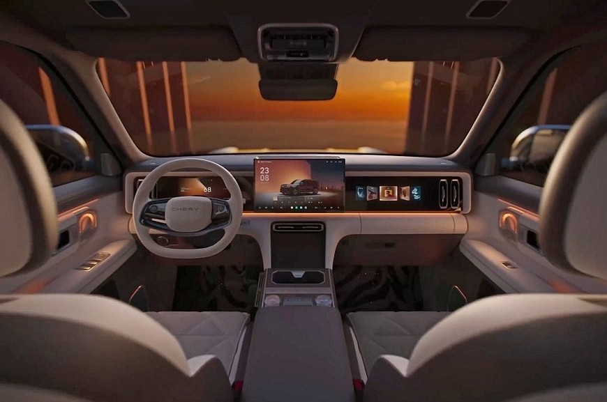 Главные фишки экстерьера – прямоугольные фары с пикселями, пиксельное же табло, которое объединяет головную оптику, внушительные бамперы и вертикальные задние фонари. Над лобовым стеклом установлен лидар, ведь Chery Tiggo X обещан автопилот Falcon 700. Размеры новинки не озвучены.