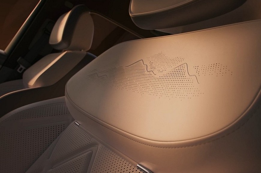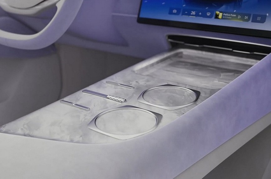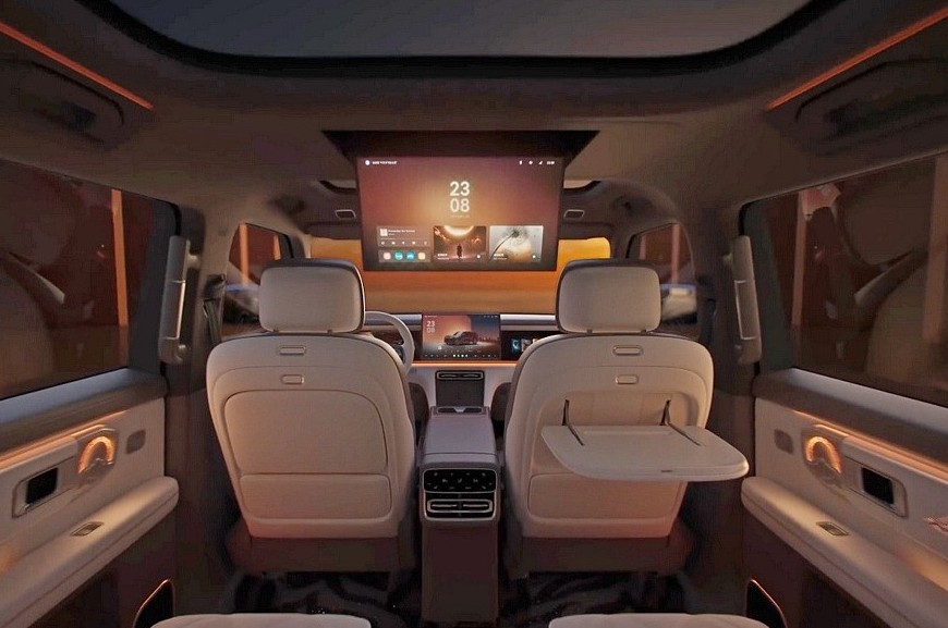 В шестиместном салоне – три экрана на передней панели и двухспицевый руль. Боковые дефлекторы обдува сделали вертикальными. На центральном тоннеле расположены беспроводная зарядка, пара неприкрытых подстаканников, физические клавиши и «хрустальные» шайбы. В торце тоннеля – сенсорная панель для основных настроек. У задних пассажиров есть свой, «потолочный», развлекательный дисплей. В спинки передних кресел встроены откидные столики.