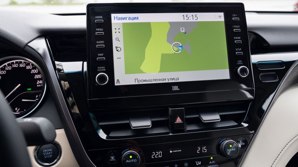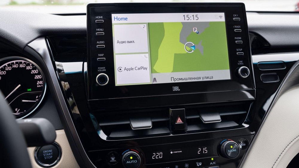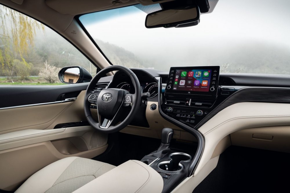 В целом архитектура передней панели практически не изменилась: по сути, единственное новшество – это перенос экрана мультимедийки, ранее вписанного в панель, на верх этой панели в виде «планшета», как это популярно сейчас. Базовый экран мультимедийной системы сохранил диагональ в 7 дюймов, а старший слегка подрос – до 9 дюймов. Что важнее, обе мультимедийки получили поддержку Apple CarPlay и Android Auto, а старшая оснащена штатной навигацией. В качестве дополнения для единственного исполнения «Люкс Safety» предложен набор онлайн-сервисов Toyota Connected Services, среди которых поиск машины на стоянке, сообщение о ДТП с припаркованной машиной, удаленный контроль заряда аккумулятора, история поездок и так далее. Правда, за этот функционал придется немного доплачивать и в дальнейшем: предустановленная SIM-карта от МТС имеет лишь 1 год предоплаченного трафика с лимитом в 10 Гб ежемесячно, а по истечении этого срока платить по тарифу оператора будет уже сам владелец. И еще одна новость для тех, кто в свое время купил Camry прошлого поколения в спецверсии Exclusive с мультимедийной системой на Android с сервисами Яндекса: в новой Camry такую интеграцию можно не ждать – по крайней мере, в обозримом будущем. Зато обновилась цветовая гамма декоративных вставок – взгляните, как это выглядит вживую.