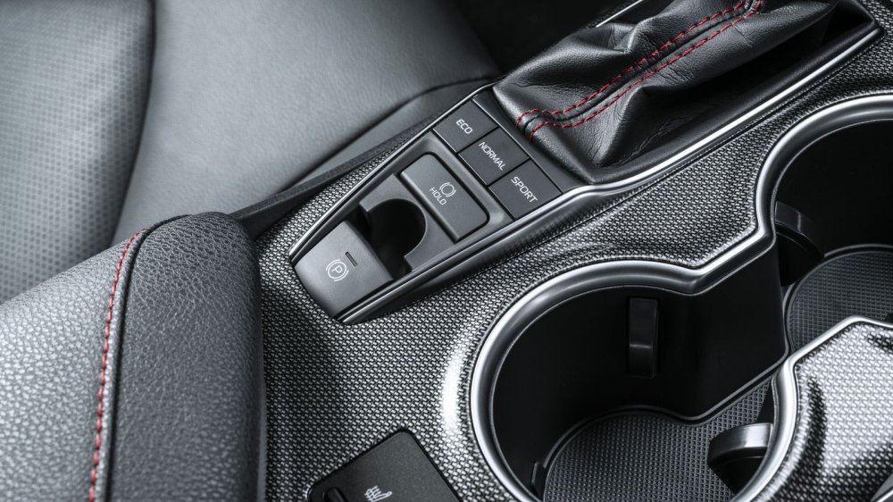 Однако тем, кто ждет от красной Camry более агрессивной динамики, можно не строить надежд: технически версия GR Sport абсолютно идентична обычным седанам. Настройки подвески и рулевого управления, отдача мотора – все осталось без изменений, прибавка чисто стилистическая. Единственное технической особенностью наделены Camry GR Sport с мотором V6: здесь за селектором АКП появились кнопки принудительного выбора режимов движения Eco, Normal и Sport. Меняют они исключительно настройки силового агрегата, делая его отзывчивей и расторопней в спортивном режиме. И пусть руль не «наливается спортивной тяжестью», не говоря уже о шасси, в некоторых ситуация принудительная настройка может оказаться полезной.