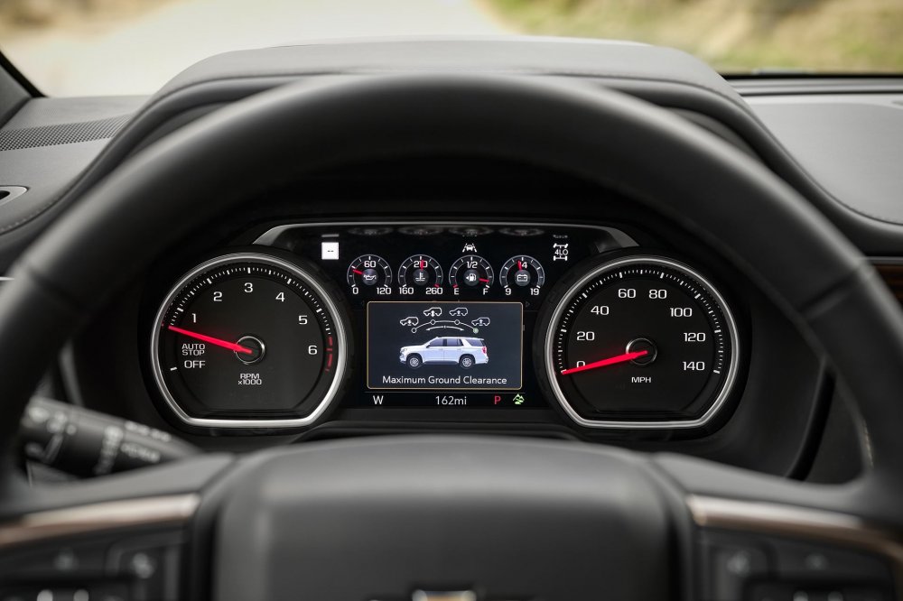 Да, рабочее место водителя Tahoe без «кочерги» кажется странным и непривычным. Но, как оказалось, привыкнуть к новой системе управления коробкой очень просто, поскольку она вполне логична. И хорошо, что сама схема подразумевает полную «защиту от дурака» – случайно врубить заднюю, двигаясь при этом по шоссе с приличной скоростью, абсолютно нереально. Опять же, мне понравилась комбинация приборов с двумя настоящими аналоговыми циферблатами и большим цветным дисплеем, на который можно вывести прорву всякой полезной информации вплоть до угла поворота колес (поверьте, на бездорожье это бывает исключительно полезно).