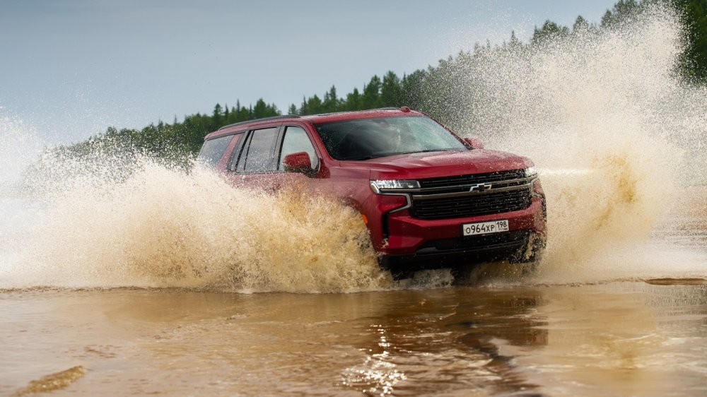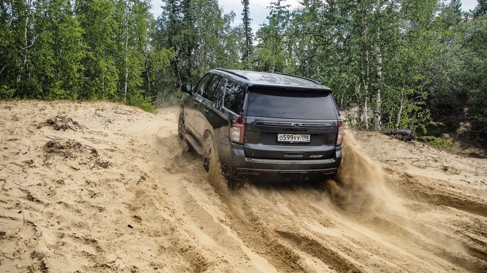 Тема «Тахо на бездорожье» – она вообще особая. С одной стороны, по массе признаков Tahoe – вполне полноценный внедорожник, с рамой, понижающей передачей в раздаточной коробке и самоблокирующимся дифференциалом заднего моста. С другой – кидаться на этом автомобиле на покорение абсолютных дебрей будет только не совсем адекватный человек. Вес, габариты, большая колесная база – все это превращается в факторы, снижающие проходимость. Опять же, обзорность: на серьезном рельефе, особенно при проходах через перегибы, огромный, как палуба авианосца, капот полностью закрывает обзор вперед-вниз.