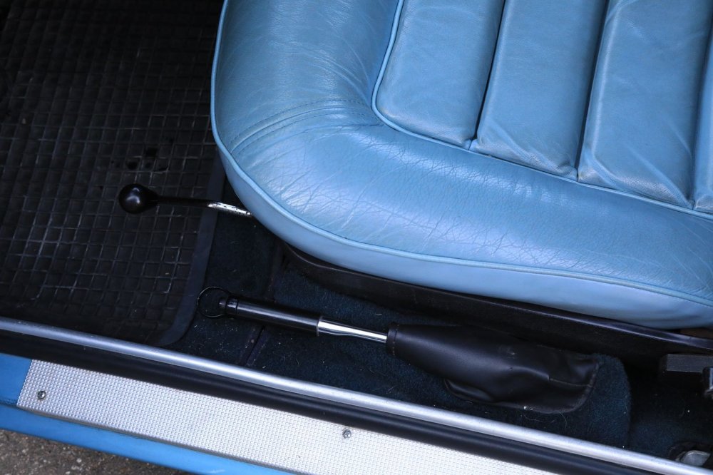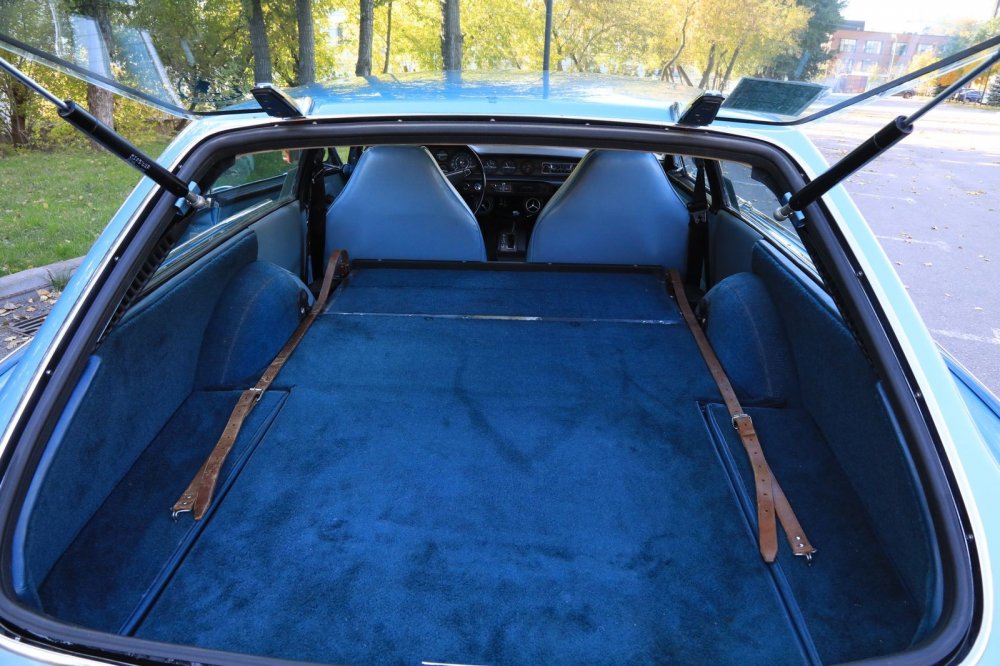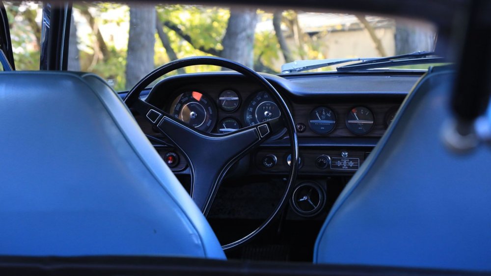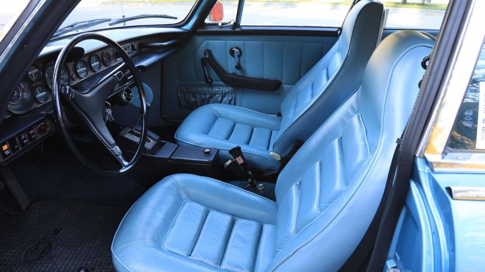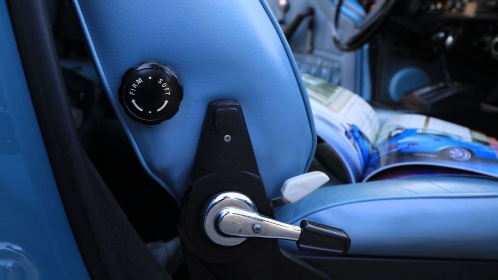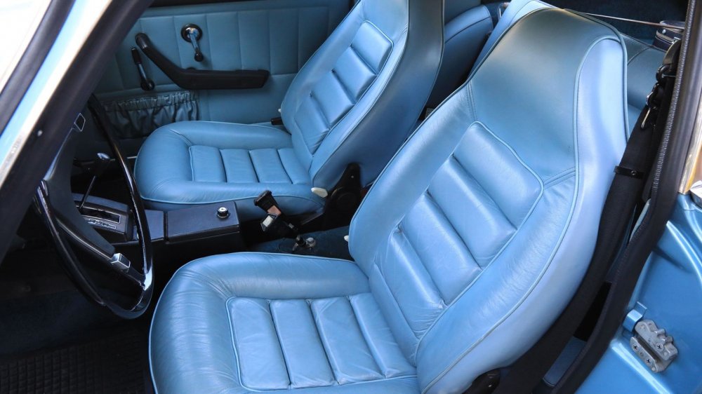 Обшивка салона – под цвет кузова: небесно-голубой винил и кожа. Смотрится несколько холодновато, но зато великолепно визуально расширяет пространство! К слову, это оригинальный цвет отделки, а помимо голубого для модели были также доступны красный, черный, бежевый и пара оттенков коричневого.