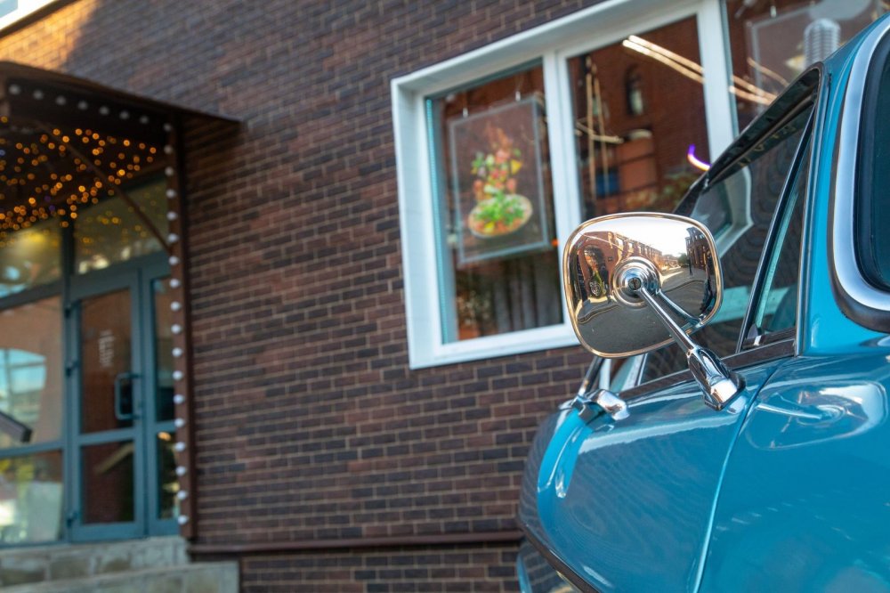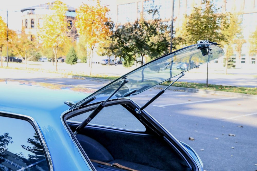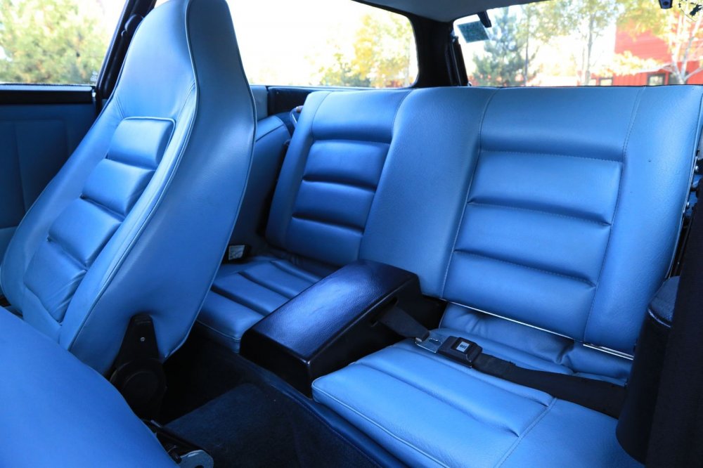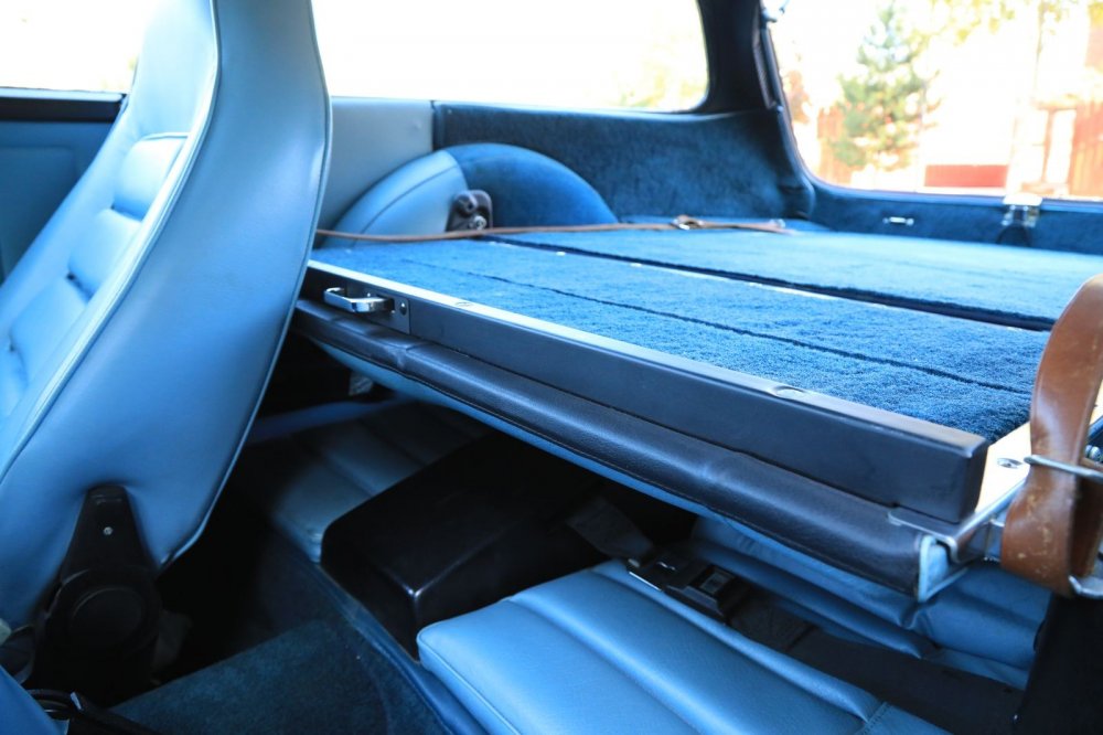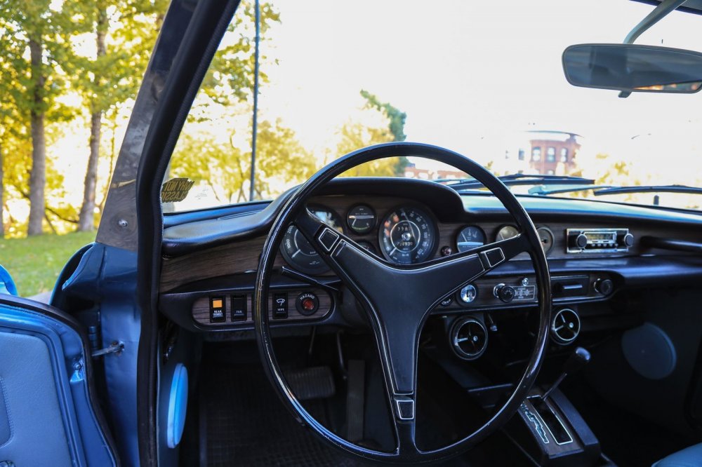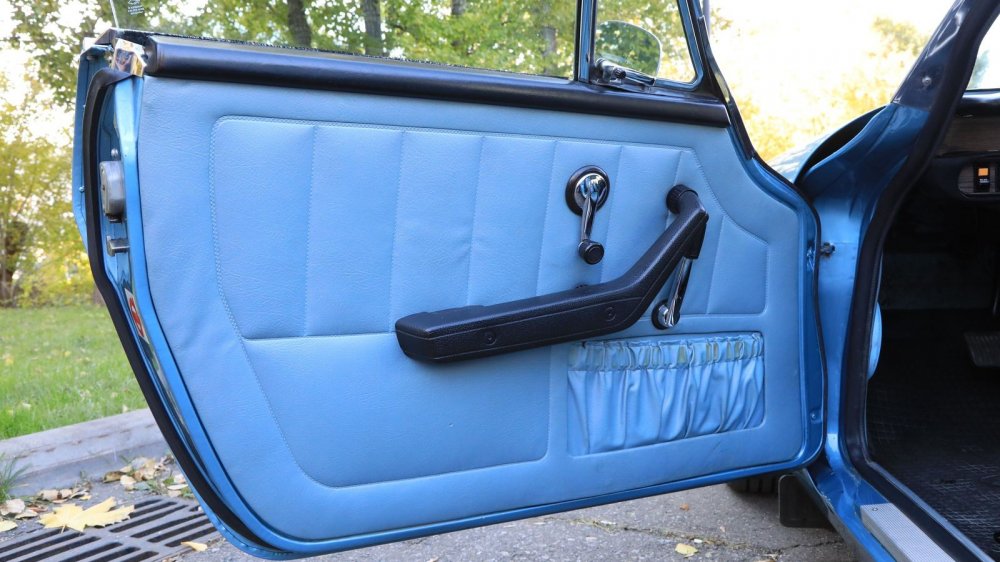 Обшивка салона – под цвет кузова: небесно-голубой винил и кожа. Смотрится несколько холодновато, но зато великолепно визуально расширяет пространство! К слову, это оригинальный цвет отделки, а помимо голубого для модели были также доступны красный, черный, бежевый и пара оттенков коричневого.