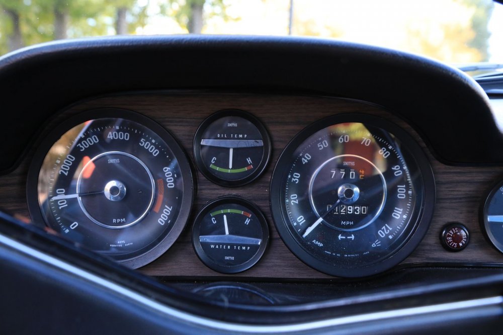 На панели – честный полный комплект приборов: спидометр, тахометр, температура масла и антифриза, давление масла, бензомер и стрелочные часы. На упрощенную лампочку индикации исчезновения зарядки заменили только лишь вольтметр. Интересно, что все приборы в P1800 – породистые, от Smith Instruments, каноничного британского производителя автомобильных индикаторов, основанного в 1881 году часовщиком Сэмюэлем Смитом. В 1904 году король Эдуард VII попросил Смита изготовить прибор для измерения скорости движения его автомобиля, и после открытия первого завода по массовому производству спидометров в Европе первое же серийное устройство было записано в журнале заказов как «№1, для Его Величества Короля, Букингемский дворец»…