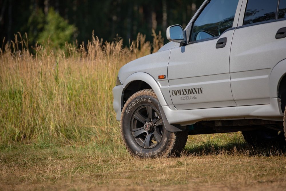 Задняя подвеска Musso и Musso Sports – комфортная для пассажиров пружинная (в пику конкурентам, которые ставили продольные рессоры), а вот спереди – менее распространенная, торсионная. Похожая на подвеску Isuzu D-Max старых выпусков, Trooper, Pajero Sport первого поколения и т.п. Автомобиль Александра не выглядит задранным, но тем не менее он лифтован миллиметров на 30. Усиленные пружины стоят сзади, а спереди – торсионы от модификации Musso с мотором 3,2 литра, который тяжелее. Эти торсионы чуть толще и жестче родных.