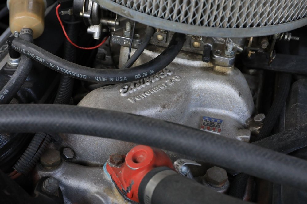 Кстати, если приглядеться, то можно увидеть маркировку Edelbrock и под карбюратором, ниже его подошвы. Дело в том, что доработка системы питания тут несколько более глубокая, чем просто замена карбюратора на «свободно дышащий». На двигатель установлен новый впускной коллектор взамен штатного – патентованный алюминиевый коллектор Edelbrock Performer 2-O с увеличенным сечением входа и лучшим распределением топливной смеси. Вместе с карбюратором такая система, как заявлял производитель, заметно улучшала крутящий момент и отклик на педаль в широком диапазоне оборотов – с холостых и до 5,5 тысяч.
