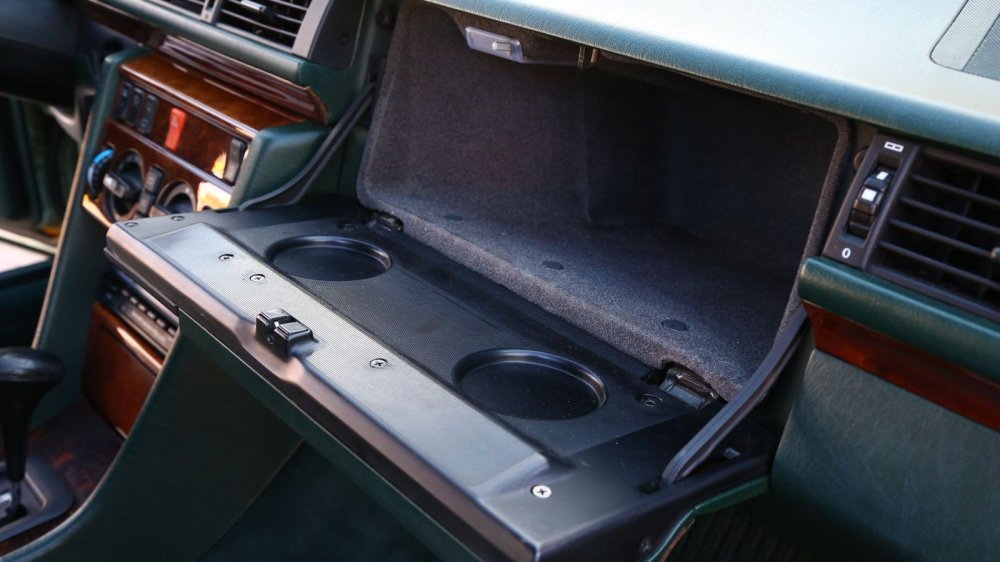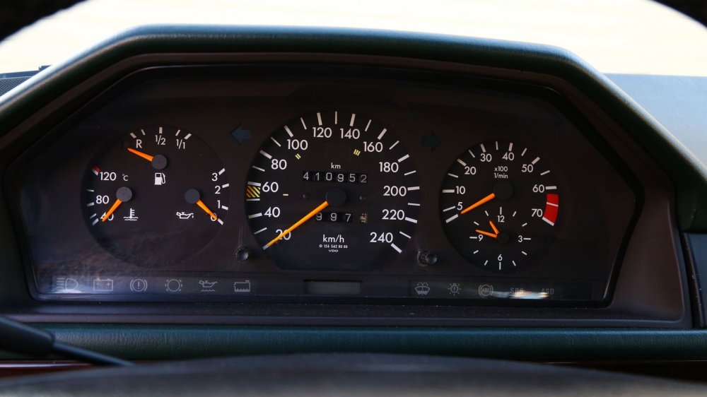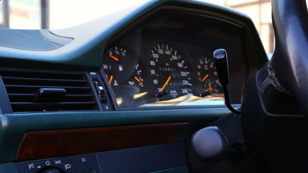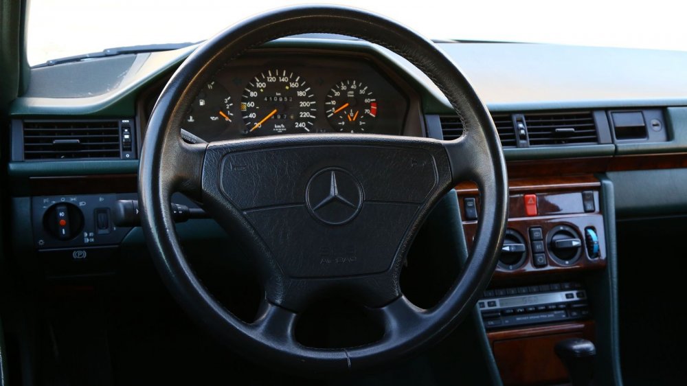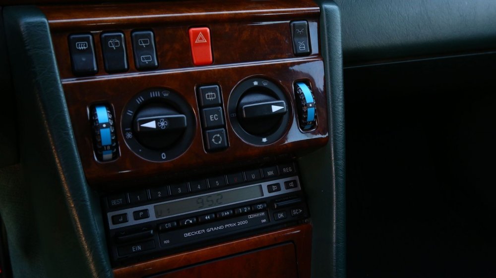 Внутри – все то, что долгие годы было узнаваемыми чертами породы Mercedes. Благородная отделка под орех без сутенерского китча, трапециевидный козырек приборной панели, переключатель света с оранжевой точкой, аудиосистема Becker Grand Prix 2000 с фирменным колесиком регулятора громкости «перед/зад» на тоннеле рядом с рукояткой КПП. Магнитолы Mercedes – это, к слову, вообще отдельная религия –  почитайте.