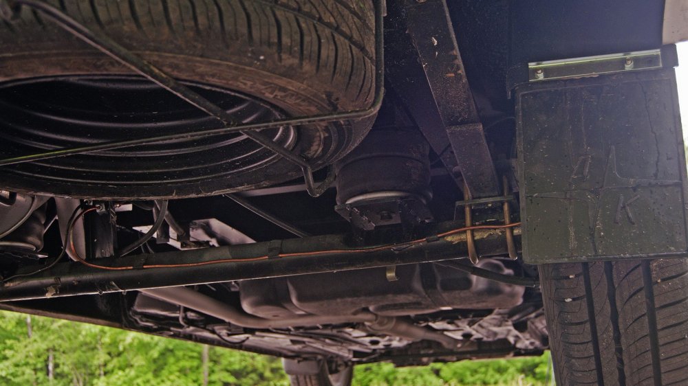 Как вы знаете, задняя подвеска Гранты – с полузависимой балкой, на пружинах и амортизаторах. Балка-то у неё осталась, а вот пружин больше нет – вместо них стоят рессоры и пневмобаллоны. То есть, теперь тут типично грузовая подвеска. Рессорная Гранта – это что-то новое. Интересно, как она поведёт себя на дороге?