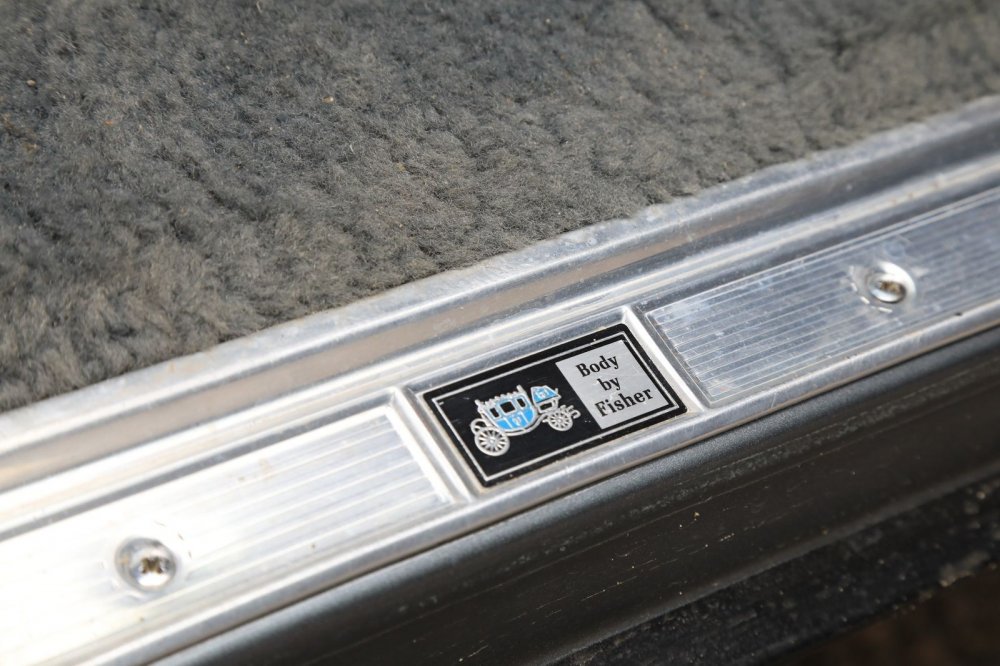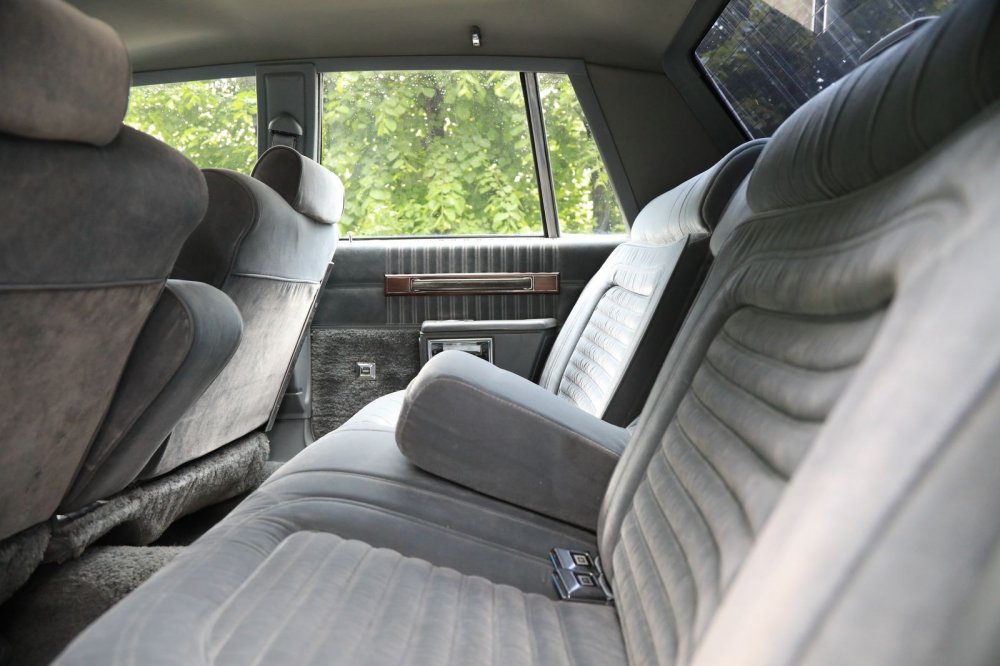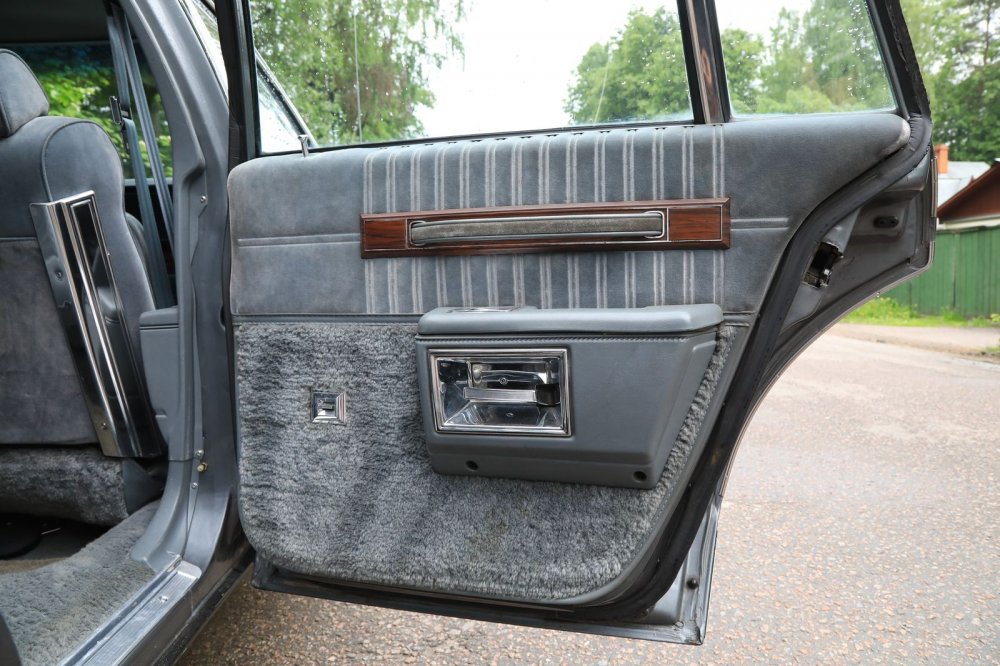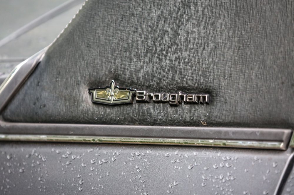 Крыша автомобиля выглядит при беглом взгляде как подъемная – но на самом деле она обычная, жесткая и стационарная. А сверху с переходом на задние стойки добавлен так называемый «vinil top» – оклейка фактурным винилом «под кожу», предлагавшаяся в виде опции на дорогих комплектациях. А наш экземпляр может похвастать еще и комплектацией Brougham – что это значит, поговорим, когда переместимся в салон.